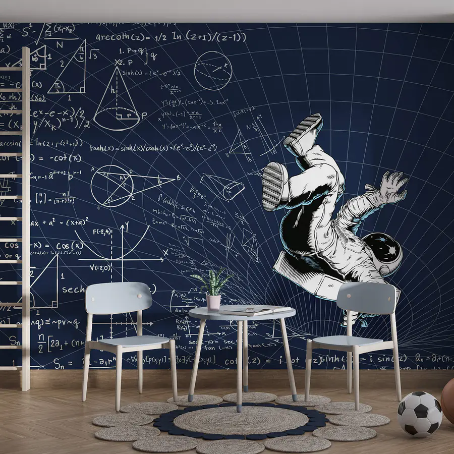 Fototapety Muž v skafandri padajúci na tabuľu s matematickými rovnicami