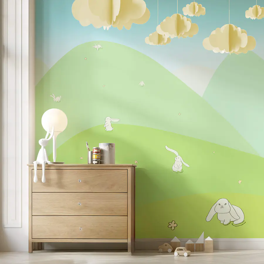 Fototapety Karikatúra zajačikov na zelenom kopci