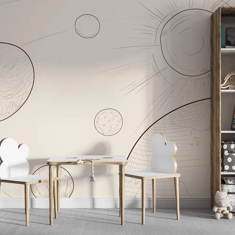 Premeňte akýkoľvek priestor na kozmickú krajinu s touto podmanivou nástennou maľbou znázorňujúcou Slnko a Zem, ktoré sa točia vo svojom večne ladnom tanci. Predstavte si, ako na ňu hľadíte, zatiaľ čo vaše deti počúvajú rozprávky na dobrú noc a ich fantáziu rozpaľujú myšlienky na planéty, hviezdy a nepreskúmané galaxie. Jemné línie a snové farby vyvolávajú pocit pokoja a dobrodružstva zároveň. Či už je to v detskej izbe plnej energie alebo v útulnom kútiku, ktorý je ideálny na snenie, táto nástenná maľba dodáva hravý nádych, vďaka ktorému sa každý deň cíti ako výlet vesmírom. Kto by nechcel vstávať so slnkom a unášať sa na oblakoch?