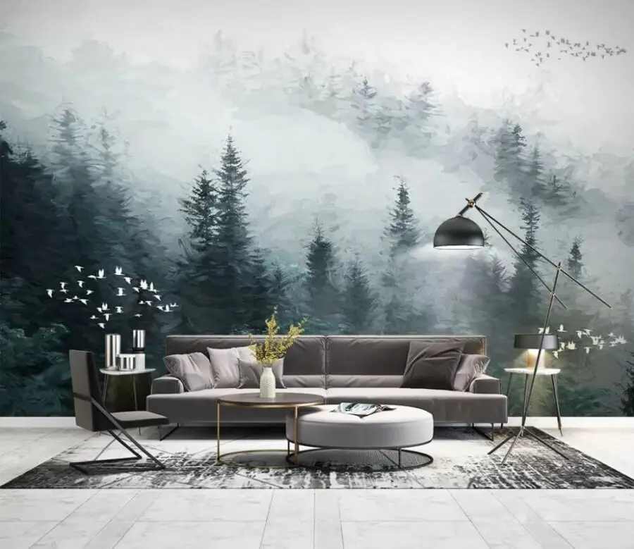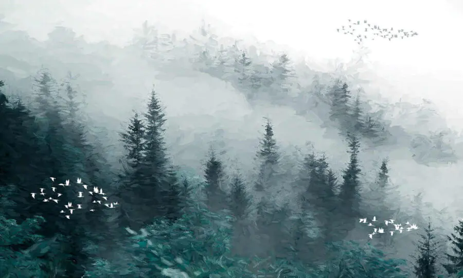 Fototapety Hmlistý les s lietajúcimi vtákmi