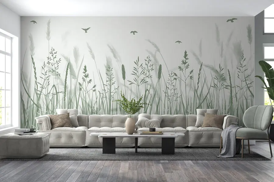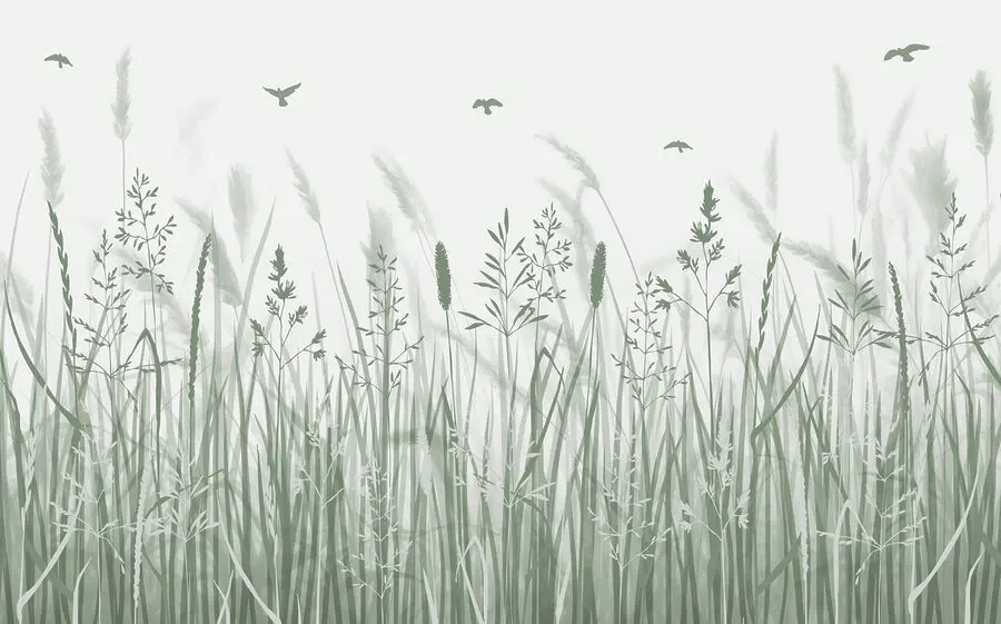 Fototapety Pole s trávou a lietajúcimi vtákmi