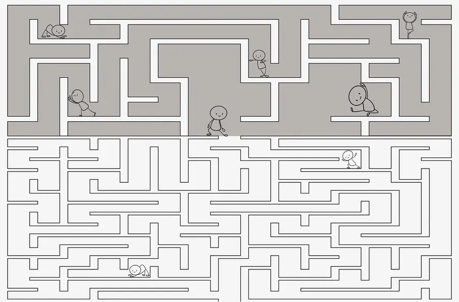 Fototapety Hra s bludiskom s kreslenými ľuďmi chodiacimi po zemi