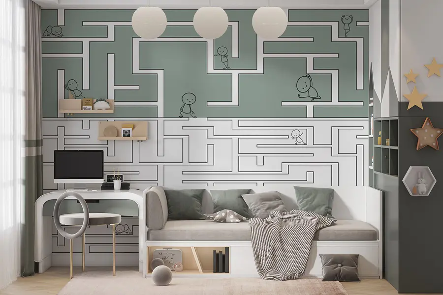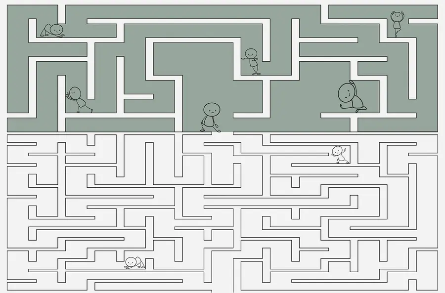 Fototapety Hra s bludiskom s kreslenými ľuďmi, ktorí prechádzajú bludiskom