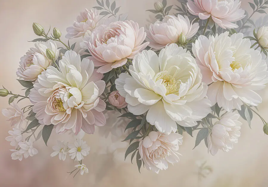 Vstúpte do rozkvitnutého raja s touto nástennou maľbou "Skupina bielych a ružových kvetov". Je to, akoby sa príroda rozhodla usporiadať tanečnú párty vo vašej obývačke a ako hosťa pozvala pivonky. Tieto kvety nie sú len pekné - sú to živé šepkoty pôvabu a pokoja. Predstavte si, že popíjate rannú kávu a jemné odtiene vás takmer vyzývajú, aby ste spomalili a dýchali. Perfektné pre tých, ktorí chcú mať nádych kvetinového šarmu bez problémov so zalievaním. Vaše steny sa vám poďakujú, verte mi!