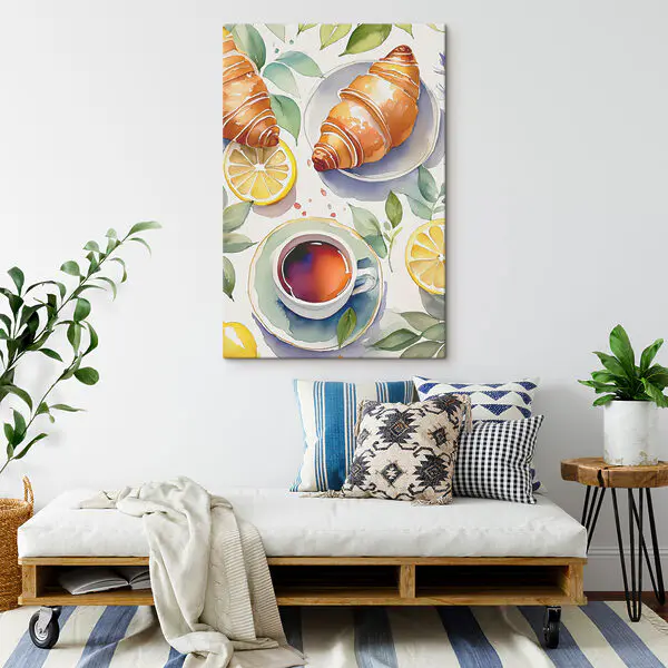 20.50 €12.30 €Obraz Akvarel croissantu a šálky čaju