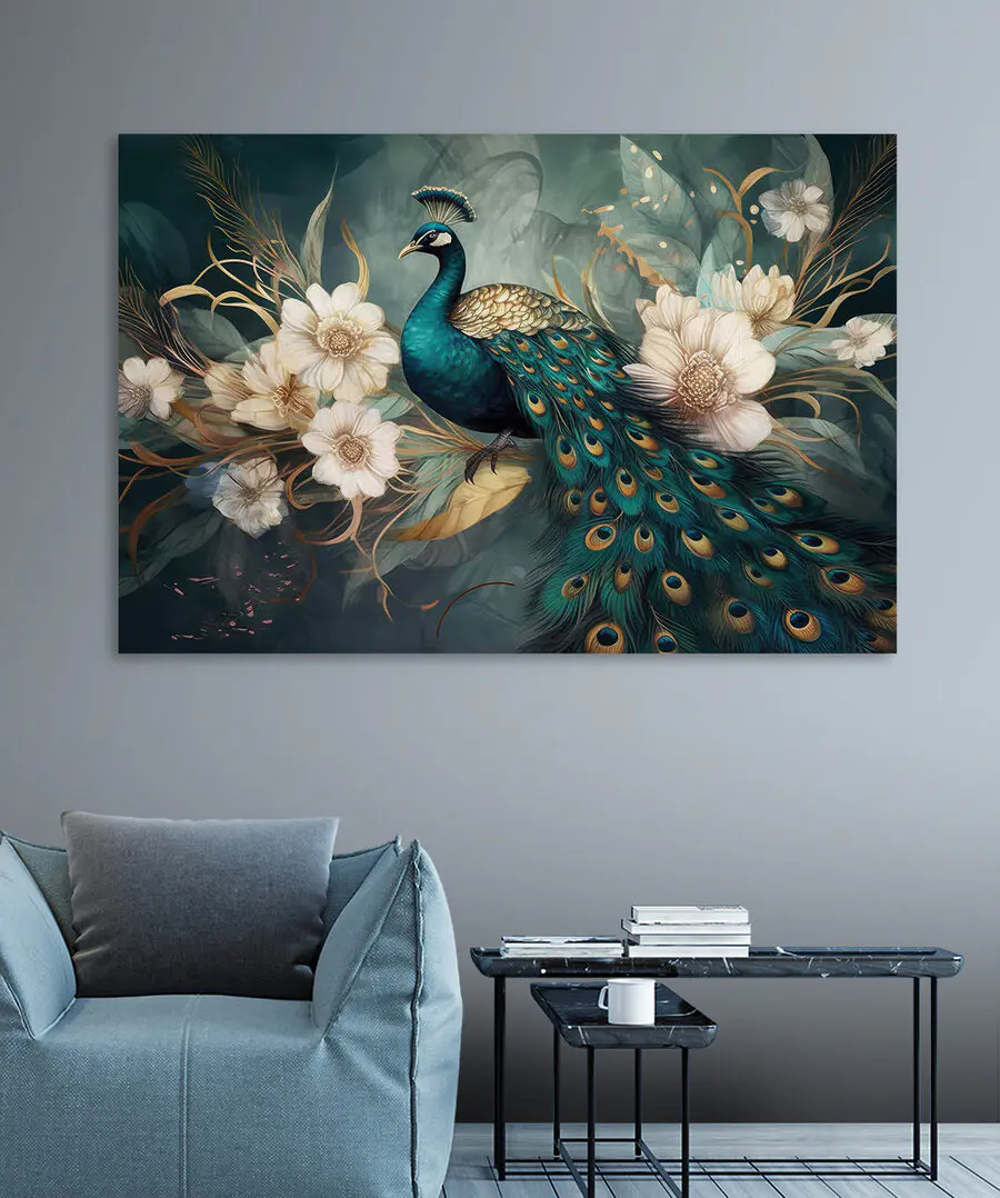 Obraz Páv sediaci na konári s kvetmi