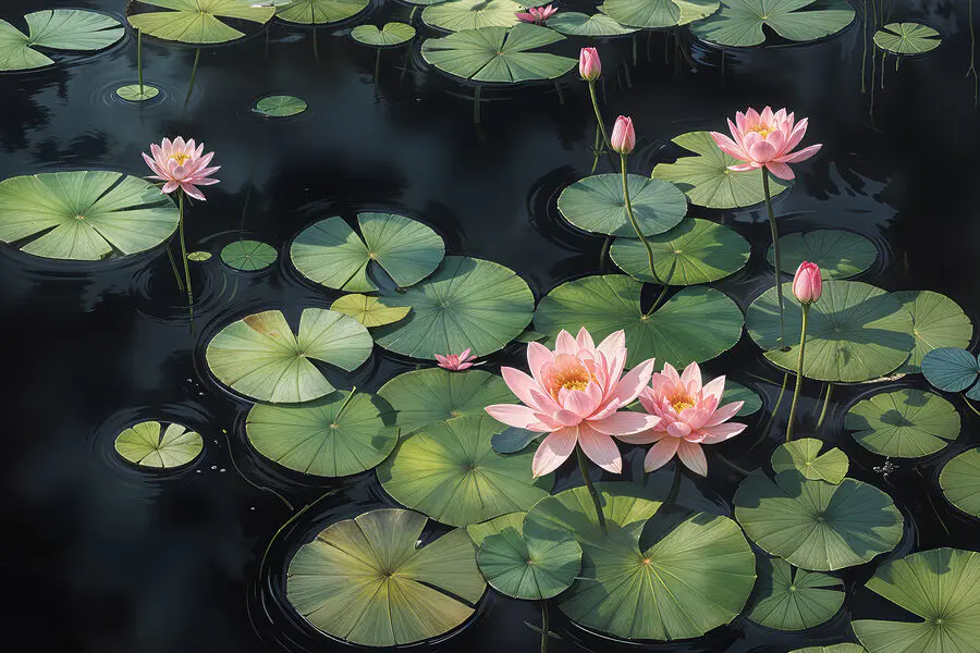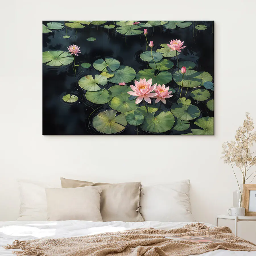Obraz Skupina ružových kvetov a zelených listov v rybníku