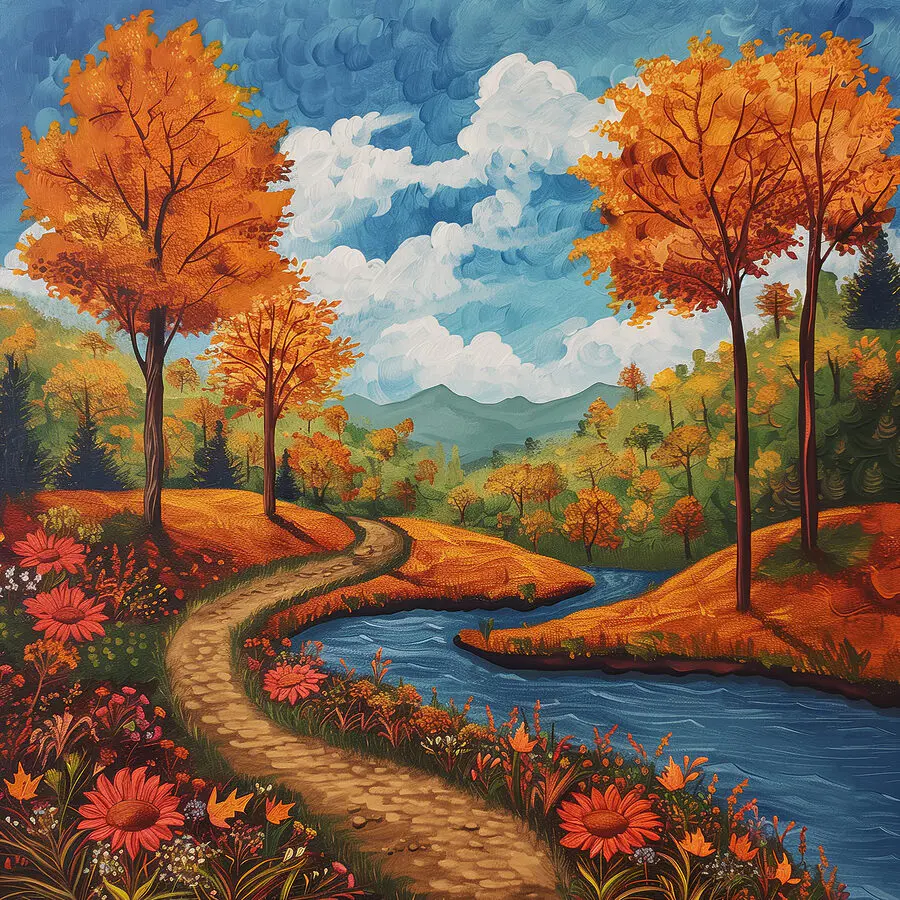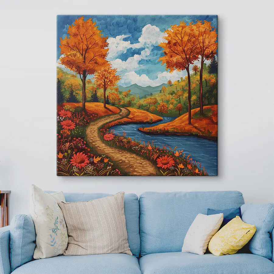 Imagine walking into a room and—bam!—there it is, a stunning canvas that feels like it's whispering, "Relax, stay awhile." This magnificent painting of a river meandering through a forest, with trees flaunting their fiery autumn hues, is a mood-lifter, no doubt. Perfect for that dull wall begging for life! Picture it: sipping tea, the rustle of leaves almost audible, nature’s beauty captured effortlessly. It's like having a window to serenity, minus the pesky mosquitoes. You’ll love the cozy vibe it brings!