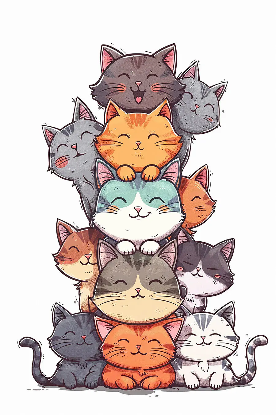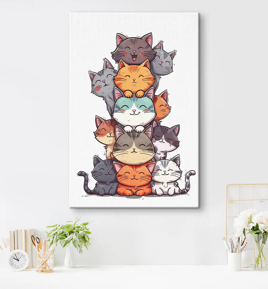 Ever seen a cuter cat pile? This canvas print is like a tower of pure joy—stacked whiskers and wide, grinning eyes that'll make anyone smile. Perfect for adding that extra bit of warmth (and a touch of whimsy) to any room. Imagine coming home after a long day, glancing at your wall, and being greeted by this adorable lineup. It's like a happy little hug from felines that won't knock over your coffee mug. Plus, it's sure to be a conversation starter. Who wouldn't love this charming kitty constellation?