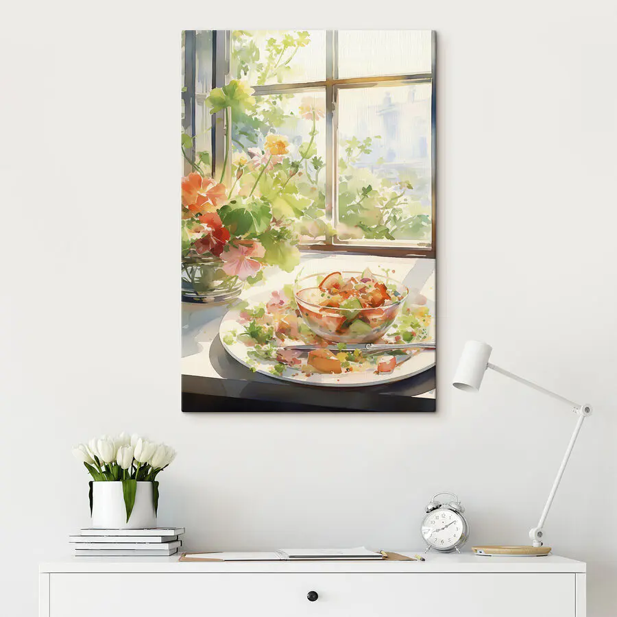 Obraz Akvarelová maľba misky s jedlom a kvetmi pred oknom