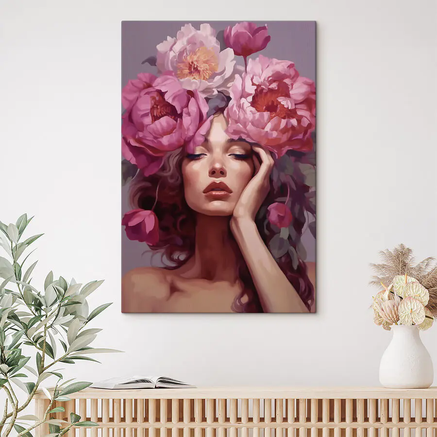Vstúpte do sveta žiarivého pôvabu s touto úžasnou potlačou na plátne, na ktorej je žena ozdobená korunou z rozkvitnutých kvetov. Je to ako preniesť si záhradu priamo do obývačky, bez zalievania! Predstavte si ju počas slnečného popoludnia, keď farby tancujú v prirodzenom svetle a vyvolávajú veselé rozhovory. Či už sa nachádza na chodbe alebo v útulnom kúte, tento kúsok vyžaruje teplo a pokoj a dodá každému priestoru štipku rozmarnosti. Len si predstavte, ako sa priatelia zastavujú, aby ho obdivovali, a možno sa aj pýtajú, kde ste našli taký jedinečný poklad. Každý pohľad prináša svieži závan radosti, takže je dokonalým doplnkom pre tých, ktorí si ctia krásu prírody.