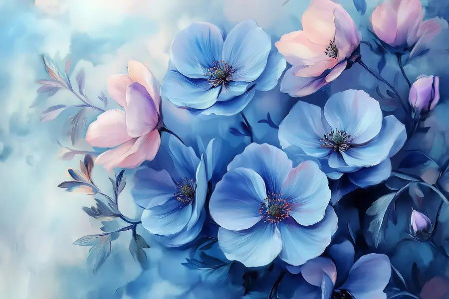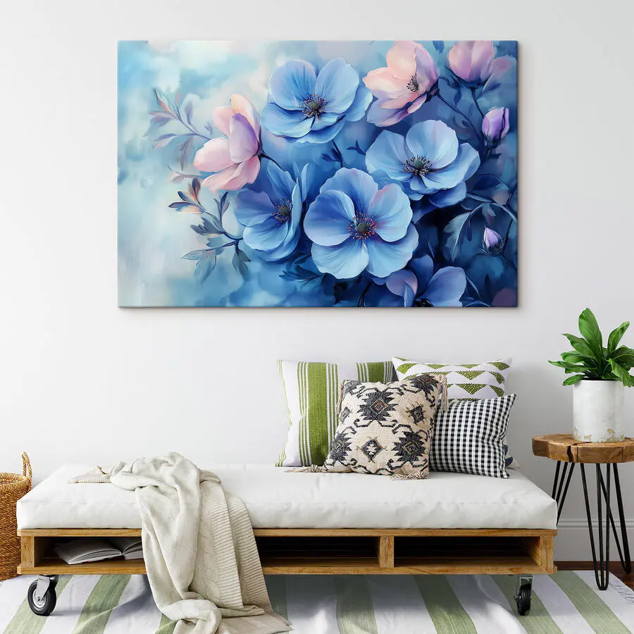 Premeňte akúkoľvek miestnosť na pokojnú oázu s "Nežnými kvetmi v upokojujúcich odtieňoch". Táto úžasná tlač na plátno zachytáva jemné kvety tancujúce v pokojných odtieňoch modrej a jemnej ružovej, ktoré navodzujú pocit pokoja, ktorému je ťažké odolať. Predstavte si, že popíjate čaj počas pokojného popoludnia a nežné odtiene vás obklopujú ako hrejivé objatie. Ideálny pre útulný kútik alebo stenu, ktorá potrebuje trochu lásky. Je to ako priniesť kúsok prírody do interiéru bez peľu! Viete, len toľko šarmu, aby rozžiaril váš priestor, ale nie natoľko, aby vám ukradol celú show. Perfektné, však?