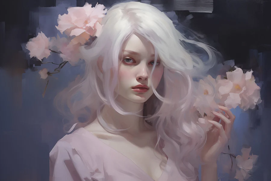 Obraz Žena s dlhými bielymi vlasmi a ružovými kvetmi